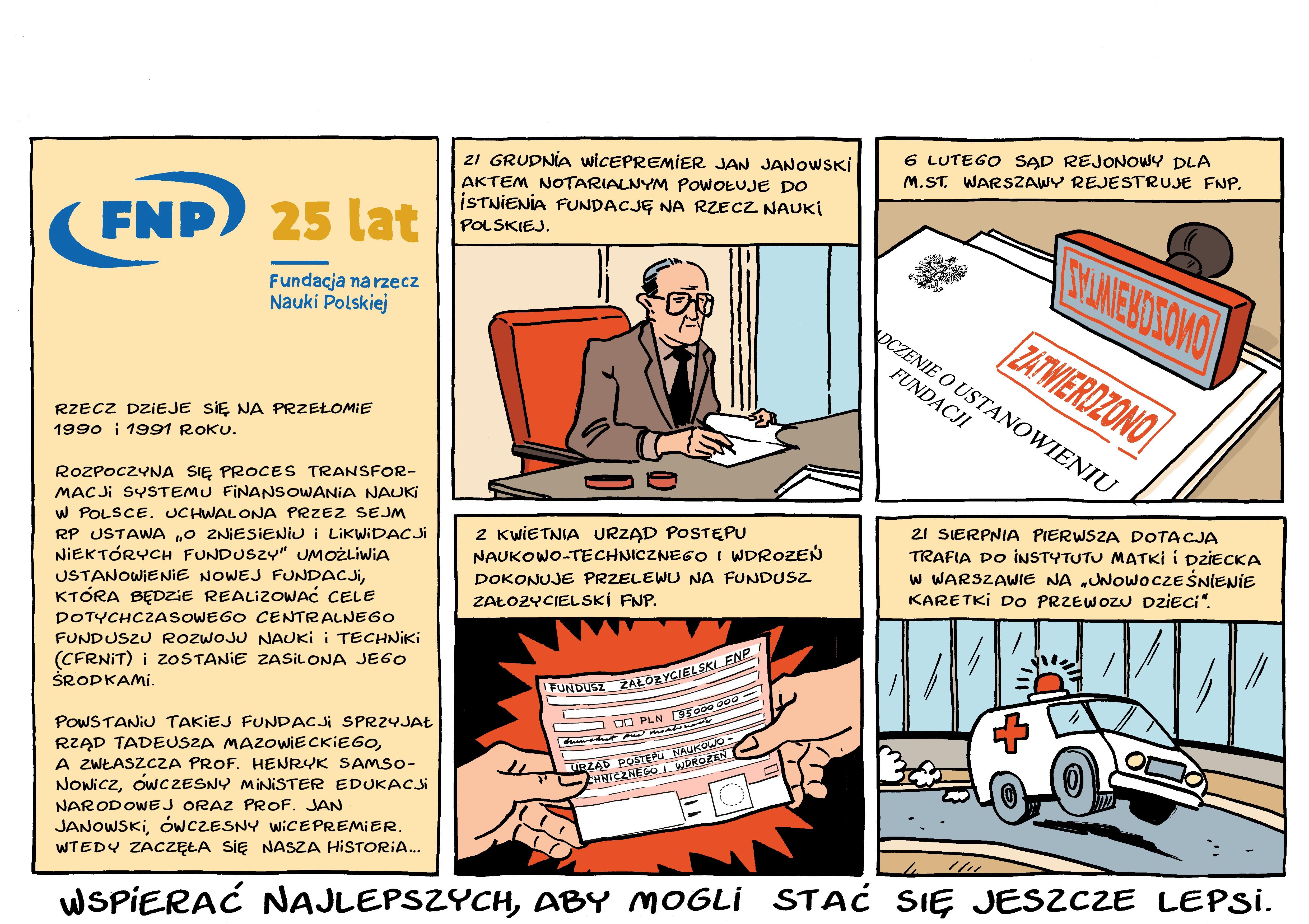 6 lutego 1991 r. Sąd Rejonowy w Warszawie zarejestrował Fundację na rzecz Nauki Polskiej. Nowa, niezależna, samofinansująca się organizacja stała się z czasem największym w Polsce pozarządowym źródłem finansowania nauki.